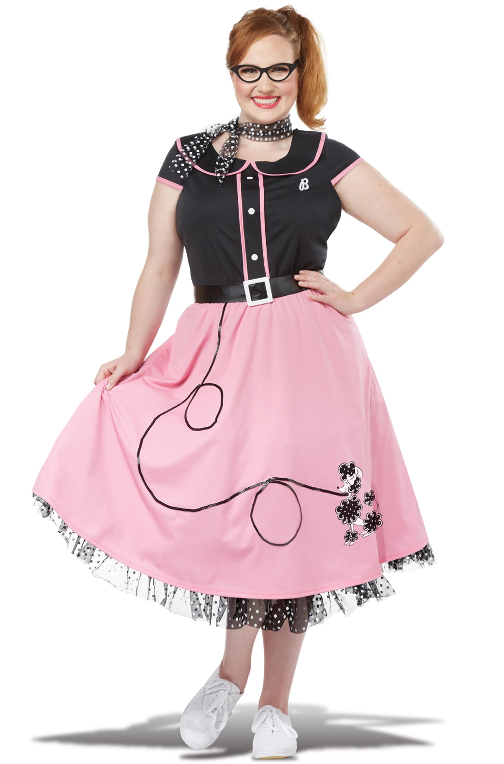Show everyone what the 1950s were really like with this plus size Fifties Sweetheart costume. This totally cool dress features a pink poodle skirt and a polka dotted pettiskirt that’s perfect for doing the Hand Jive and the Jitterbug at your next sock hop. Not only that, but it also comes with iron-on monogram letters so you can customize your costume with your initials.